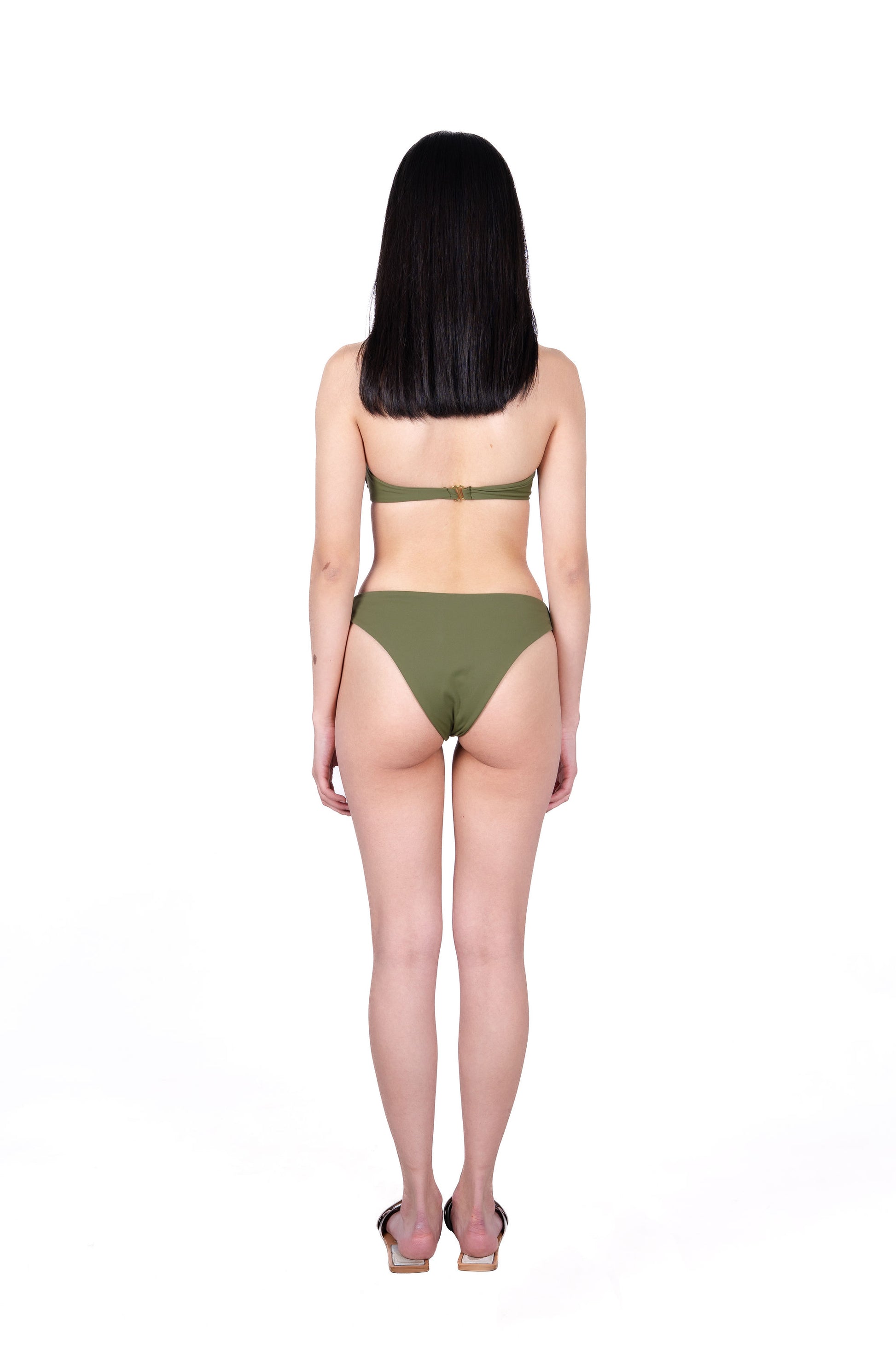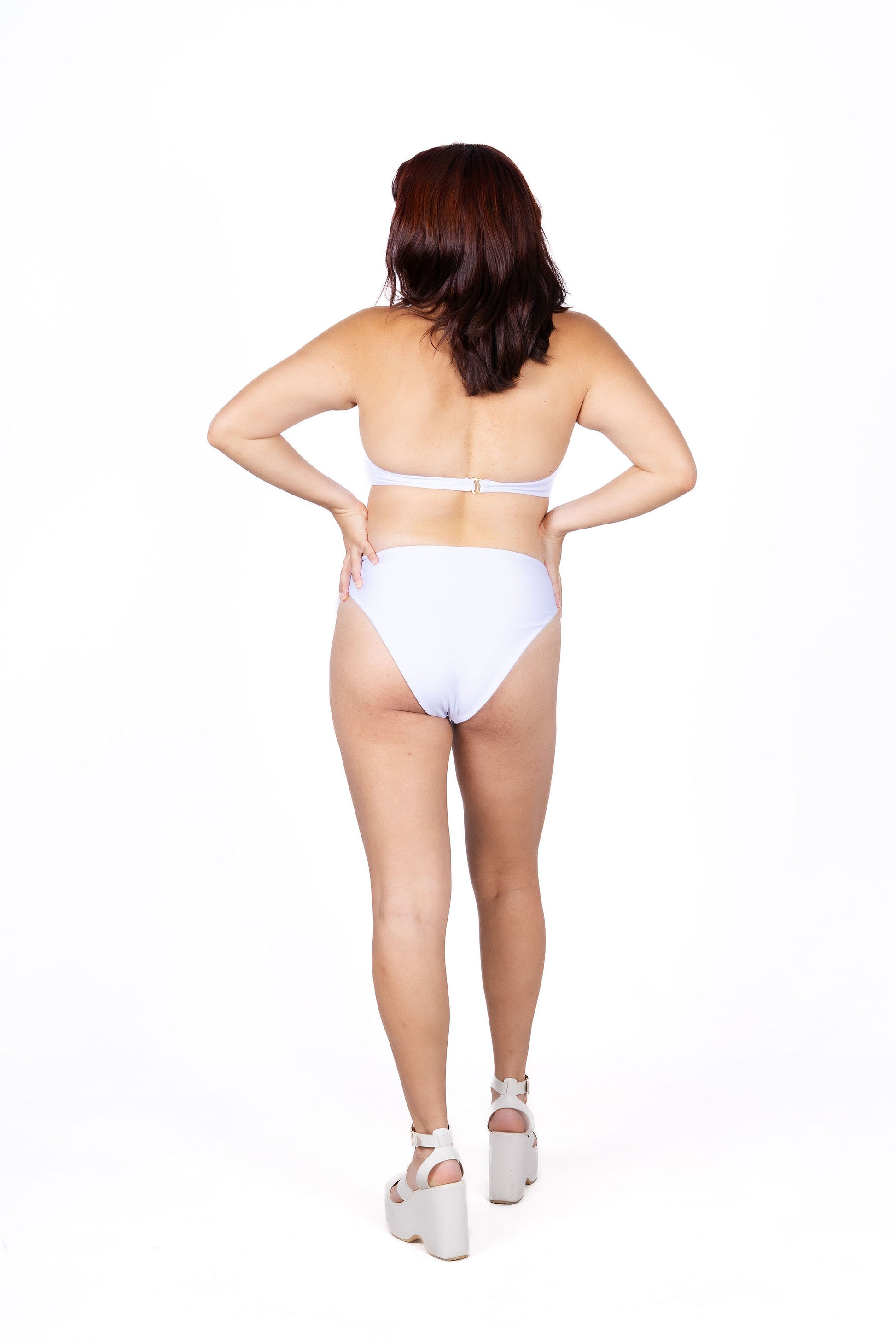 Bikini bandeau , con detalle fruncido al centro y tirantes removibles. Panty de corte en V con cobertura media